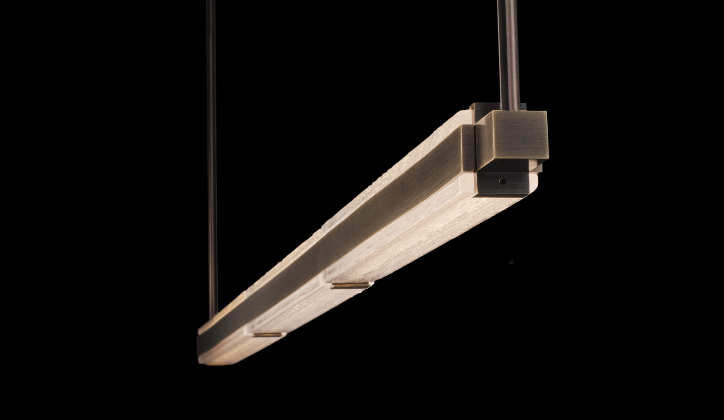 The Brooklyn Pendant seamlessly blends brass architecture with a streamlined linear form, paired with fused cast glass that sparkles with depth and texture. The slender form provides both direct and indirect illumination, making it ideal for use over dining tables, kitchen islands, and reception counters. Designed by Mark Figueredo for Boyd.